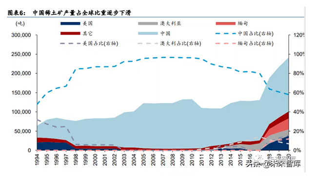 從 USGS 公布的歷史數(shù)據(jù)看,18 年前,全球主要依賴中國 供應(yīng)稀土礦,中國稀土礦供應(yīng)總量占比常年維持高位。18 年起,海外開始強(qiáng)化對(duì)自有礦山 稀土資源的開采,稀土產(chǎn)量貢獻(xiàn)占比逐漸提高。據(jù) USGS,2020 年中國配額產(chǎn)量占全球總 供應(yīng)量的 58%,較 2017 年 80%的占比顯著下降。但因中重稀土資源主要集中在中國和緬 甸,因此實(shí)際全球只有輕稀土進(jìn)入多元供應(yīng)格局,中重稀土仍主要由中國和緬甸產(chǎn)出。