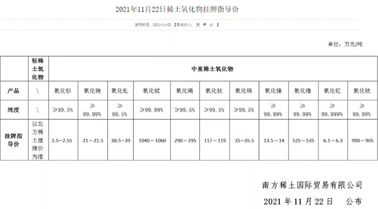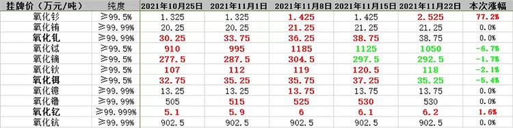 十一月二十二日,中國南方稀土國際貿(mào)易有限公司發(fā)表了中重稀土氧化物掛牌價格的漲跌互現(xiàn),前期活躍稀土品種價格持穩(wěn)或調(diào)整,而滯漲品種接棒(或個別大幅)增漲。